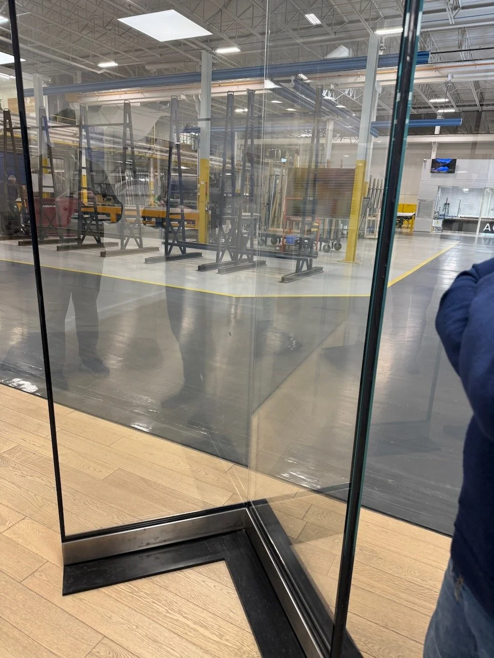 Along the way, he squeezed in an unplanned tour of Frank Lloyd Wright's Darwin Martin House in Buffalo, ended up teaching the docents, and toured AGNORA's glass factory, where he found something almost no other manufacturer will attempt: a fully miterless, corner-glazed insulated glazing unit. He also saw a project where a developer printed the image of a demolished historic building onto the glass facade of its replacement.
